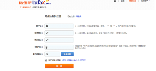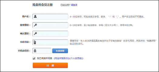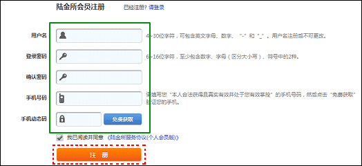 如果同意协议,填写用户名、登录密码、手机号码,点击【免费获取】,输入手机动态码,勾选“我已阅读并同意《陆金所服务协议(个人会员版)》”,点击【注册】: